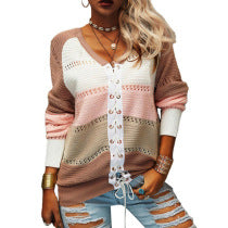 New cardigan strap sweater long sleeve color patchwork women's coat