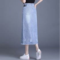 Raw edge denim slimming skirt