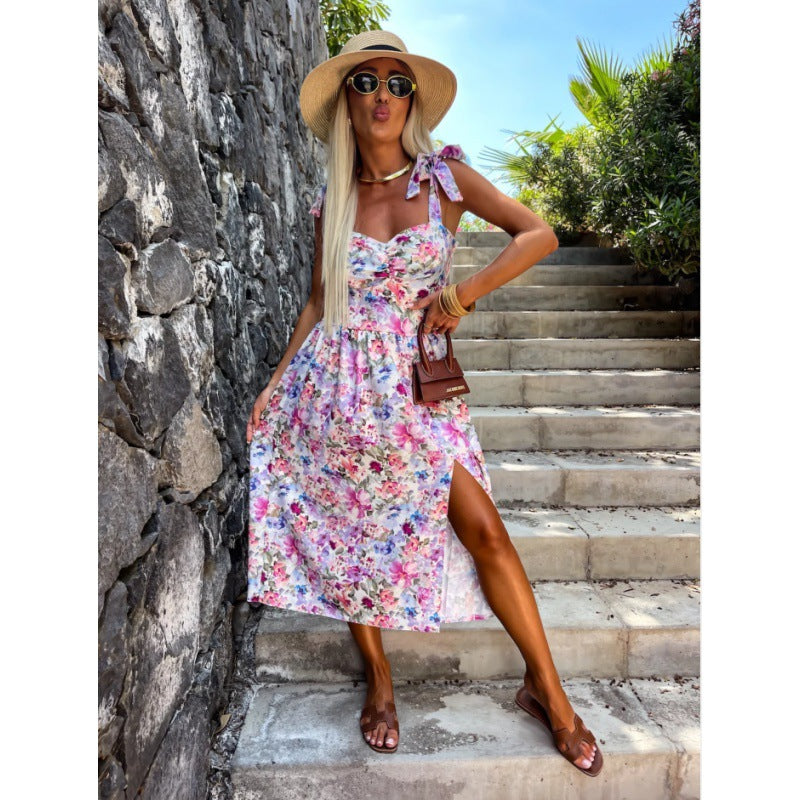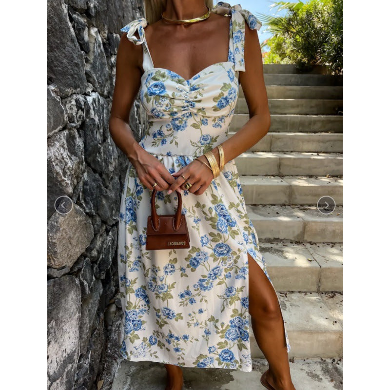The halter neckline and cinched waist create a flattering, figure-enhancing silhouette, while the thigh-high slit adds a chic, sultry touch. Crafted from a lightweight, breathable fabric, this dress keeps you cool and comfortable in the summer heat.